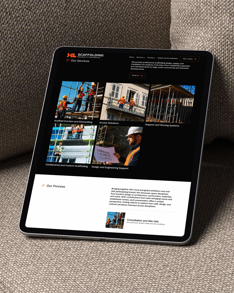From logo design to colour palette and typography, we develop a bold and modern visual system that reflects the stability and dependability of XL Scaffolding’s work. The branding evokes confidence, with strong lines and clear design echoing the structure of scaffolding itself. As the business grows, we provide continuous guidance on brand development, ensuring that XL Scaffolding’s identity evolves while staying true to its core values of safety, quality, and trust.